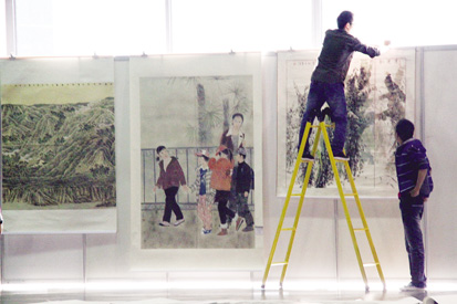 昨天,會展中心的工作人員正在緊張布展
