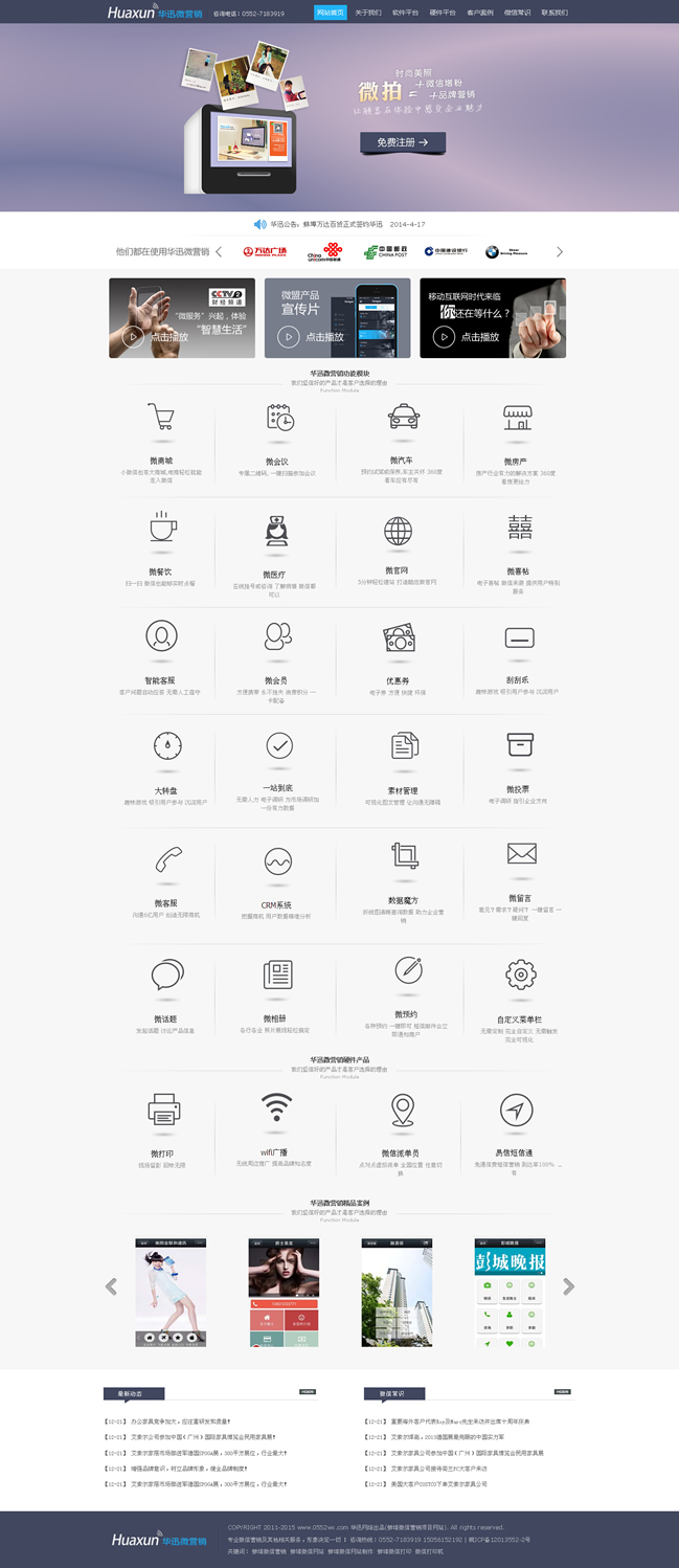華迅網絡是打造一個專門針對微信公眾賬號提供營銷推廣服務的第三方平臺。主要功能是針對微信商家公眾號提供與眾不同的、有針對性的營銷推廣服務。通過華訊微網站平臺,用戶可以輕松管理自己的微信各類信息,對微信公眾賬號進行維護、開展智能機器人、在線發(fā)優(yōu)惠劵、抽獎、刮獎、派發(fā)會員卡、打造微官網、開啟微團購等多種活動,對微信營銷實現(xiàn)有效監(jiān)控,極大擴展?jié)撛诳蛻羧汉蛯崿F(xiàn)企業(yè)的運營目標。華迅微網站平臺很好的彌補了微信公眾平臺本身功能不足、針對性不強、交互不便利的問題,為商家公眾賬號提供更為貼心的、且是核心需求的功能和服務。在線優(yōu)惠劵、轉盤抽獎、微信會員卡等推廣服務更是讓微信成為商家推廣的利器。智能客服的可調教功能讓用戶真正從微信繁瑣的日?头ぷ髦薪饷摮鰜,真正成為商家便利的新營銷渠道。